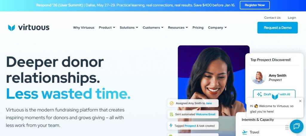 Virtuous is suitable for nonprofits that want deeper donor insights. It may be more complex for smaller teams without dedicated data staff.